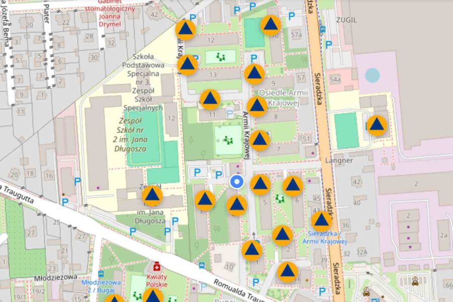 Po wpisaniu lokalizacji w wyszukiwarce aplikacji użytkownik otrzymuje listę punktów schronienia znajdujących się w promieniu do 5 kilometrów. System wskazuje najbliższe dostępne miejsca oraz wyznacza trasę dojścia, co może mieć kluczowe znaczenie w sytuacjach kryzysowych.