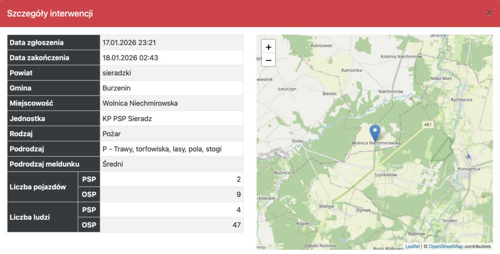 W nocy z soboty na niedzielę, 17 stycznia, doszło do pożaru stogu słomy na pograniczu miejscowości Szynkielów w powiecie wieluńskim i Wolnicy Niechmirowskiej w powiecie sieradzkim. Zgłoszenie o zdarzeniu wpłynęło do służb o godzinie 23:10.